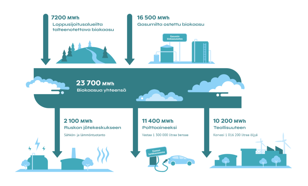 Vuonna 2025 otimme talteen loppusijoitusalueilta (entiset kaatopaikka-alueet) biokaasua 7200 MWh (vuonna 2024: 8250 MWh) ja ostimme Gasum Oy:ltä biokaasua 11 550 MWh (11 550 MWh). Näistä 2100 MWh (3800 MWh) käytettiin Ruskon jätekeskuksen sähkön- ja lämmöntuotannossa. Teollisuudessa käytettiin 10 200 MWh (7300 MWh).